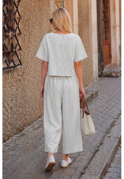 Açık Gri Keten Beli Lastikli Arkası Düğmeli Kadın İkili Takım