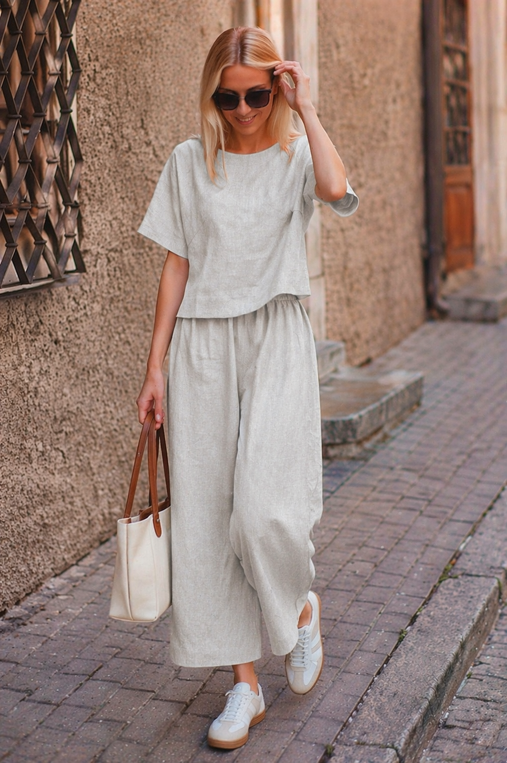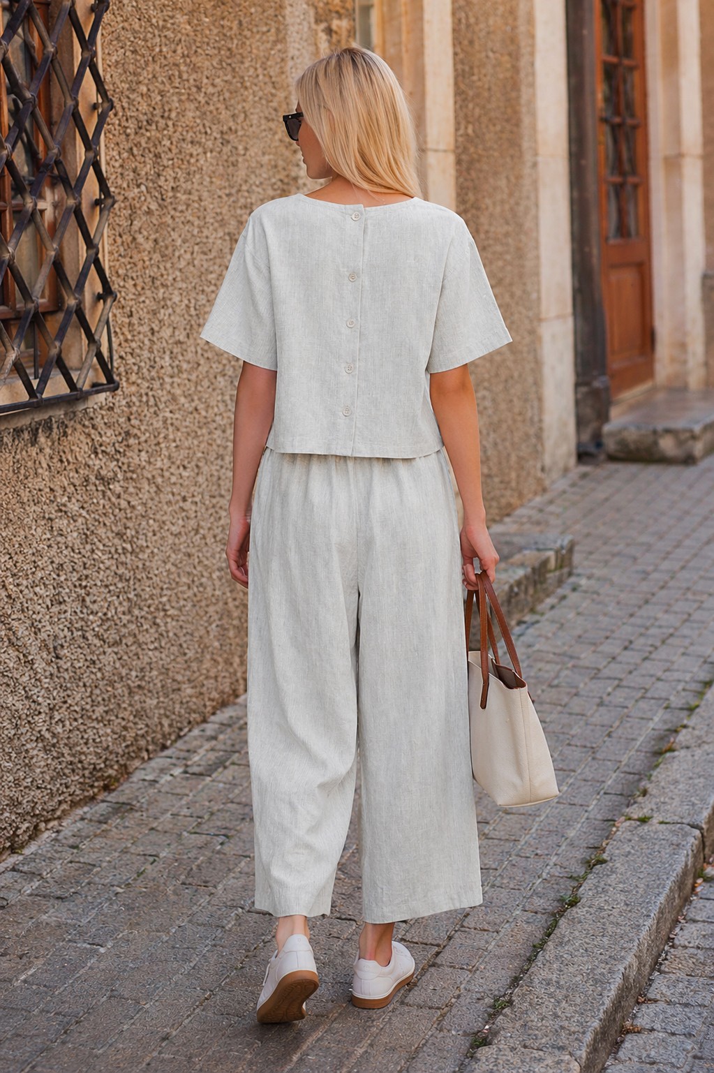 • Açık Gri Keten Beli Lastikli Arkası Düğmeli Kadın İkili Takım