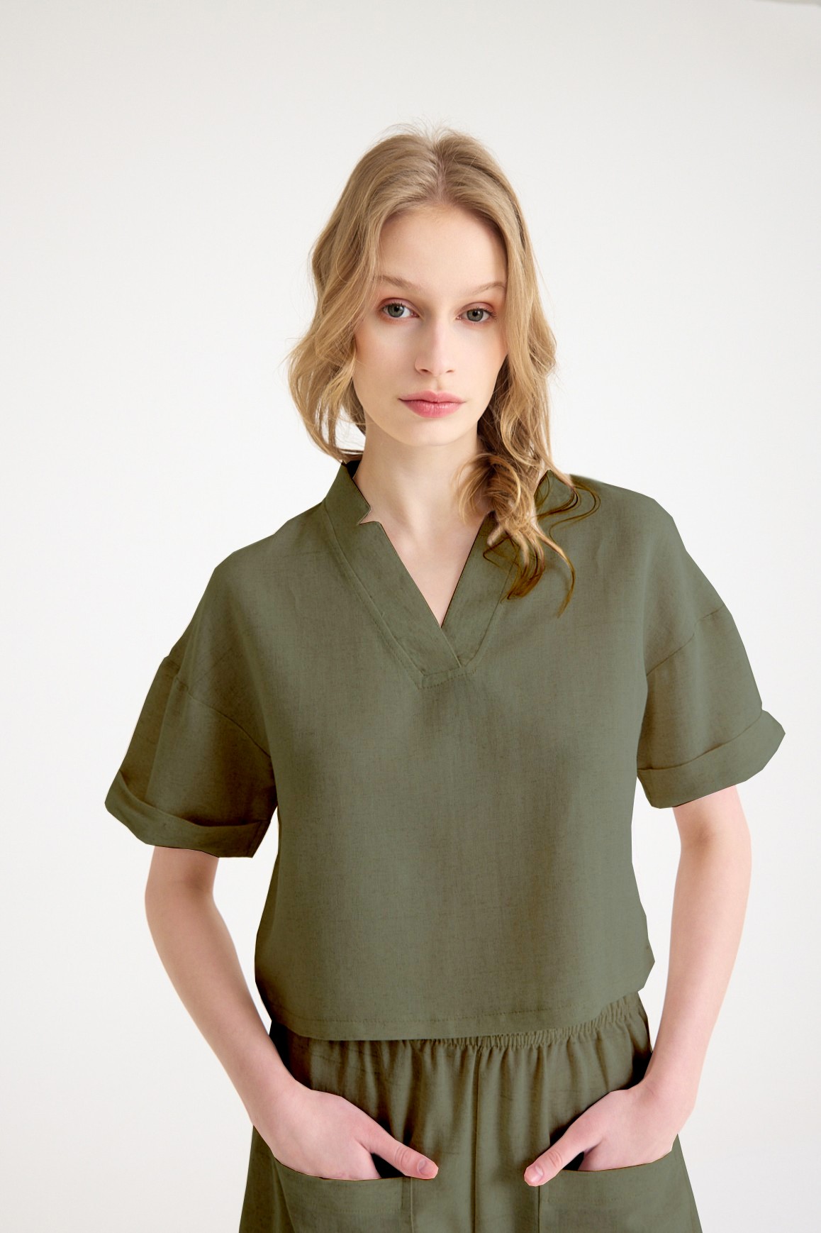 • Yaka Detaylı Şortlu İkili Haki Takım